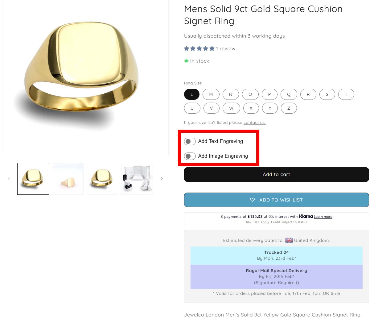 To request an engraved item, on the product page simply turn on the switch then select the number of text and/or image engravings you would like.