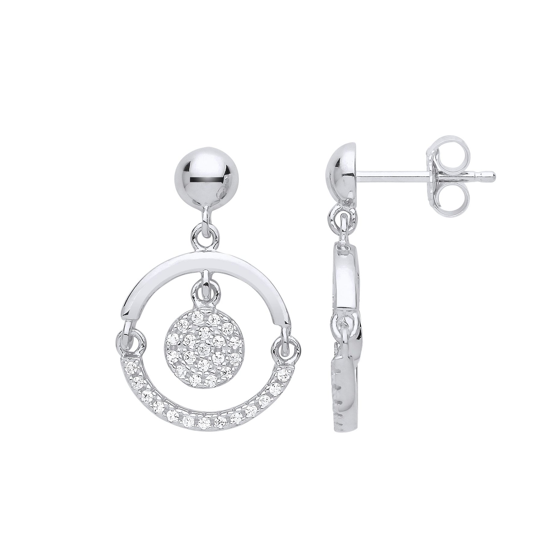 Jewelco London presents this piece from its latest collection of 925 Sterling Silver Rhodium Plated Jewellery. Ladies Rhodium Plated Sterling Silver Cubic Zirconia Swing Hoop Disco Ball Stud Drop Earrings .