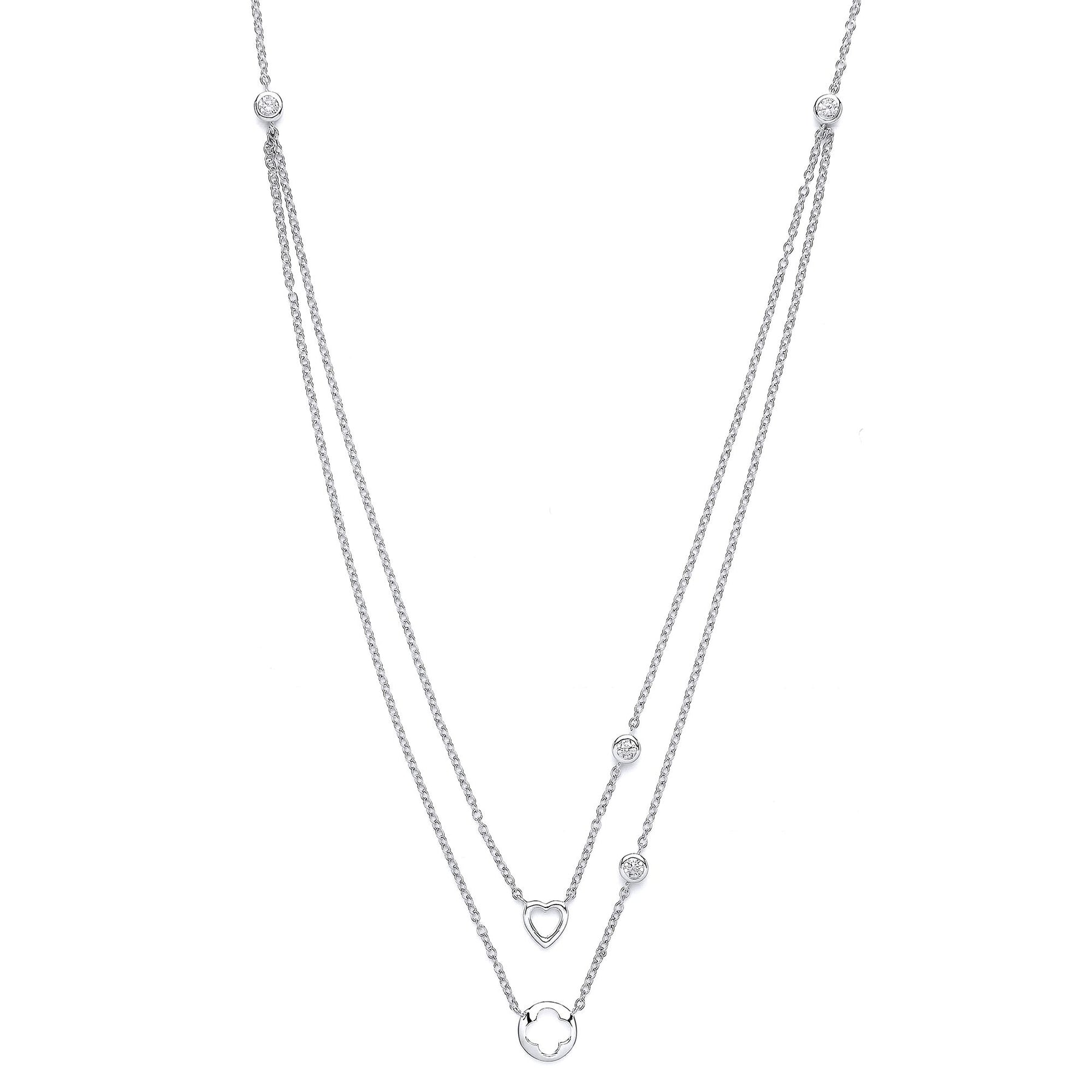Jewelco London presents this piece from its latest collection of 925 Sterling Silver Rhodium Plated Jewellery. Ladies Rhodium Plated Sterling Silver Round Brilliant Cubic Zirconia Lucky Love Heart Double Drop Necklace 17 inch .