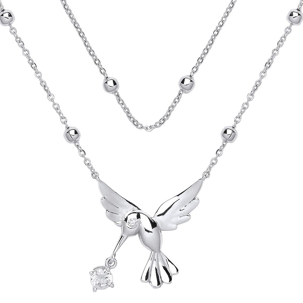 Jewelco London presents this piece from its latest collection of 925 Sterling Silver Rhodium Plated Jewellery. Ladies Rhodium Plated Sterling Silver Cubic Zirconia Hummingbird Solitaire Bead Necklace 17 inch .