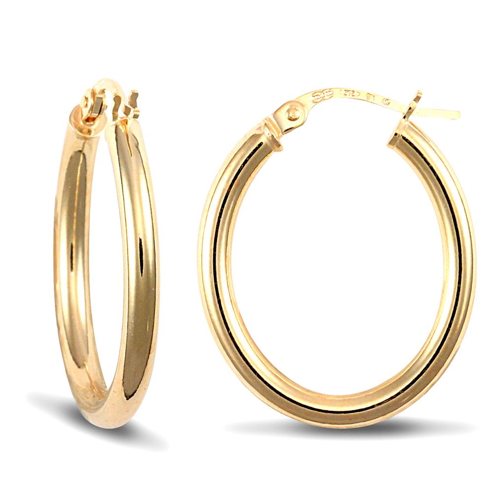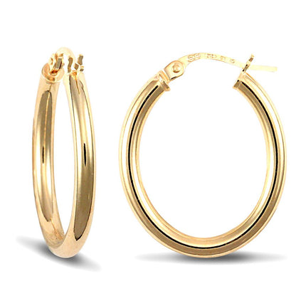Jewelco London Ladies 9ct Yellow Gold Polished Oval 3mm Hoop Earrings. Fitted with classic snap down post for easy click-on.