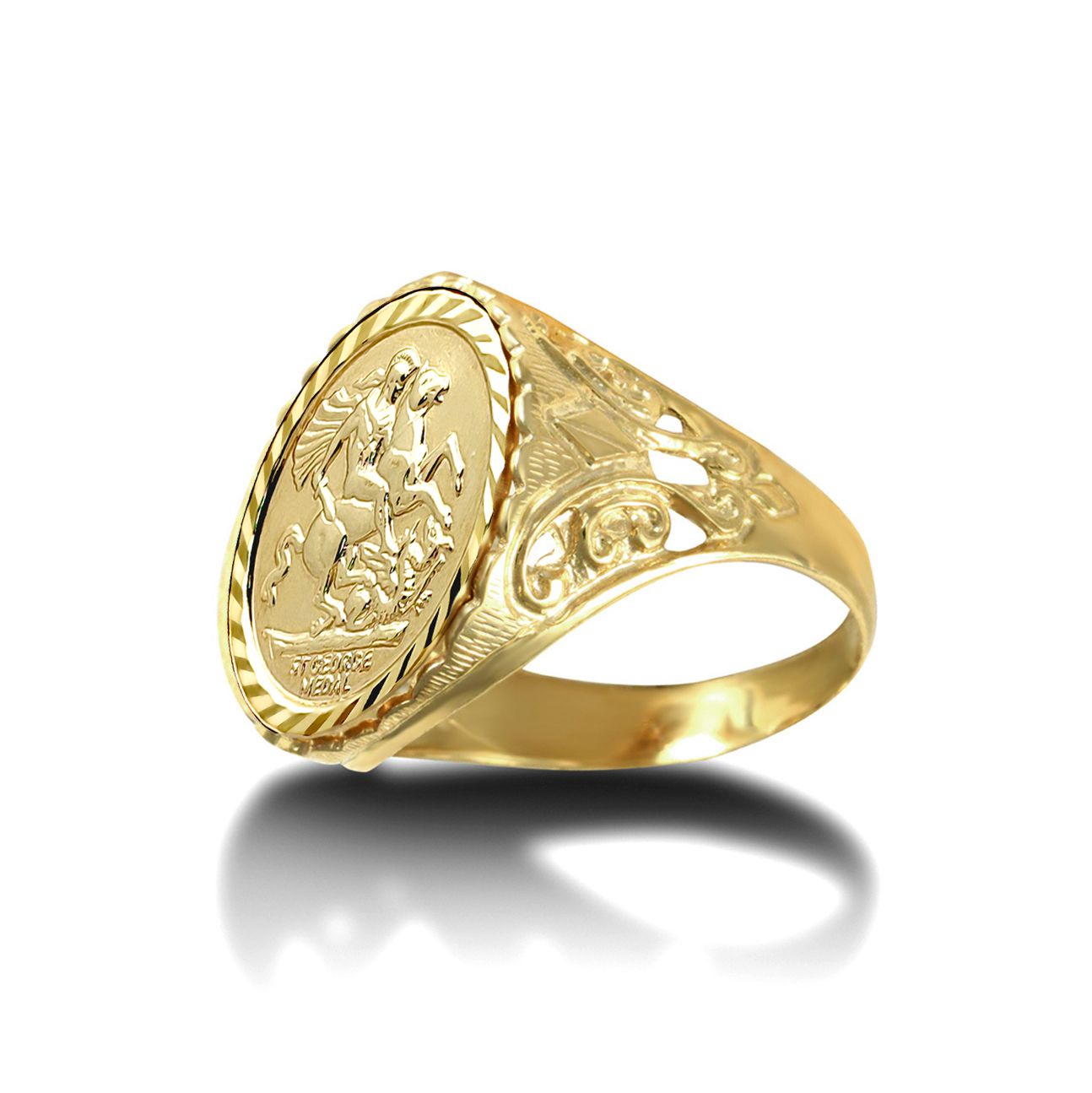 Suitable for everyday wear, this detailed St. George medallion ring features the Patron Saint of England astride his horse, in the act of slaying the dragon. George's victory over a creature widely considered to represent the devil symbolises his triumph over evil- for this reason, his likeness is often worn as protection against ill fate. This ring does NOT come with a Sovereign Coin. Rather it is set with a 9ct Gold St George medal insert, which is the same size as a Half Sovereign Coin. This way you will achieve the look of a real Sovereign Coin but at a fraction of the price! Please note, the St George medallion is part of the bezel. A regular Coin Bezel will be required if you wish to set a coin in this ring. .